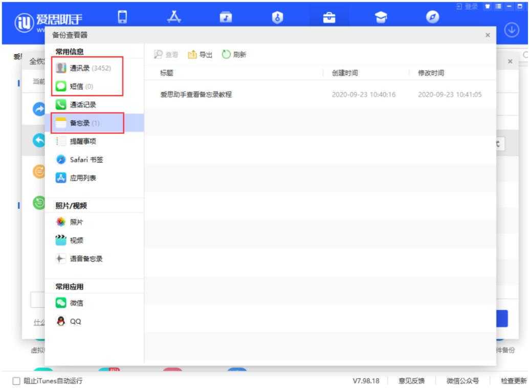 不过用户仍可以通过爱思助手全备份功能备份数据之后,再全恢复到苹果设备,就可以恢复备忘录数据。