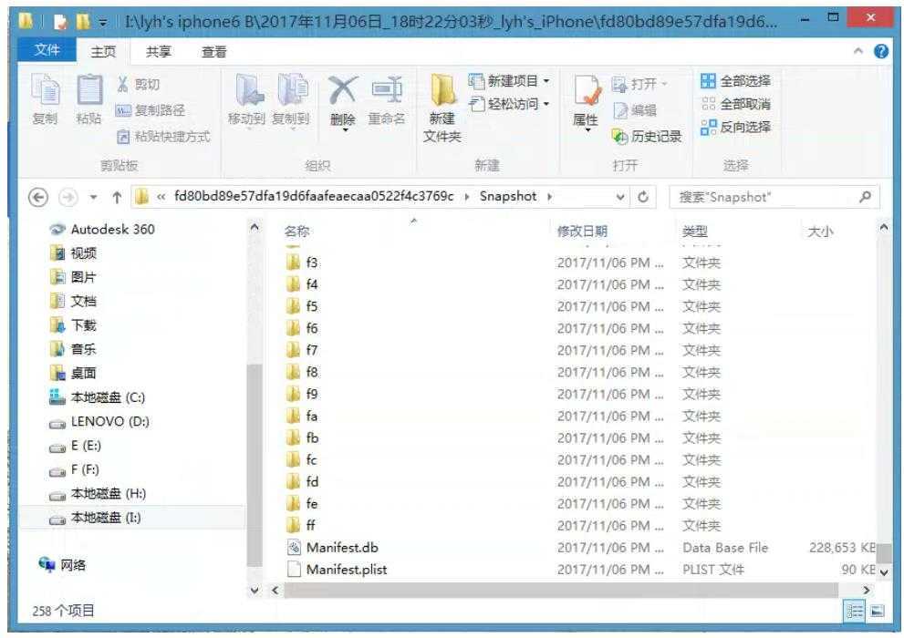 2、如果有再打开“Snapshot”这个文件夹,拉到最下面看下是否有“Manifest.db”和“Manifest.plist”这两个文件。如果以上都有,那么就可以完整的恢复整个备份,请参考步骤二恢复;如果文件不完整,请参考步骤三进行部分恢复。