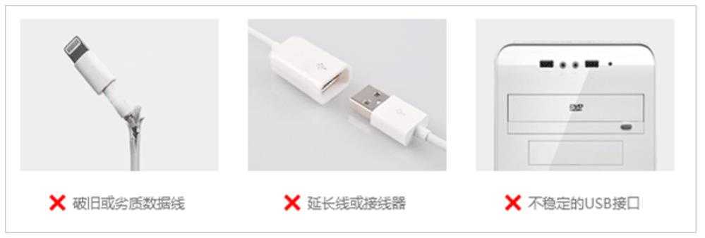 请不要使用破旧或者劣质数据线,建议您使用优质或原装数据线。不稳定的USB口包括:前置USB接口、USB转接线、USB延长线、USB扩展器、供电不足的笔记本USB接口、USB接口进灰、USB接口氧化、USB接口松动。 若存在以上情况,建议您换个稳定的USB接口或者把苹果数据线直接插到台式电脑的后置USB接口,若问题依旧,请更换其他电脑再试。