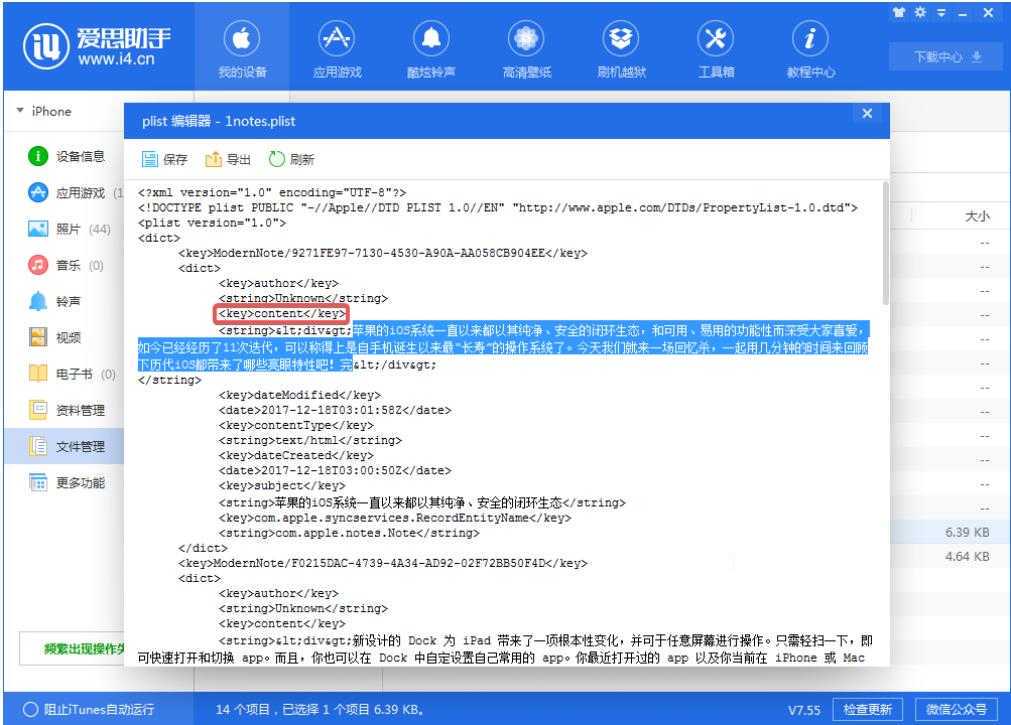 3、在“文件管理”中双击note.plist就可以查看您的备忘录内容了,content下方中的内容就是一条备忘录的完整内容,你可以将他复制到电脑文本中保存,然后将剩下的一条条的复制出来就可以了。