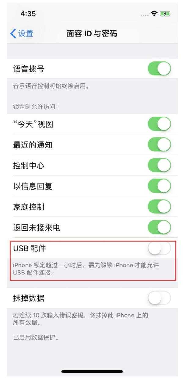 在iOS 11.4.1中,苹果加入了 USB 限制模式!若设备iOS系统 ≥11.4.1,已设置了锁屏密码,且“USB配件”没有开启(默认关闭),在设备锁定超过一小时后,多次重连设备到电脑,爱思助手仍提示“未发现设备”。