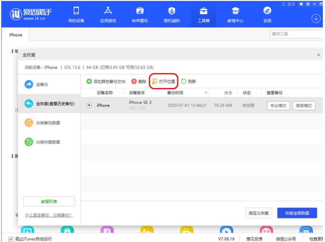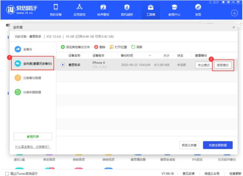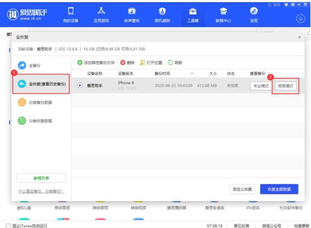 3、将需要的文件替换后,打开爱思助手“全恢复(查看历史备份)”,然后点击“简易模式”。