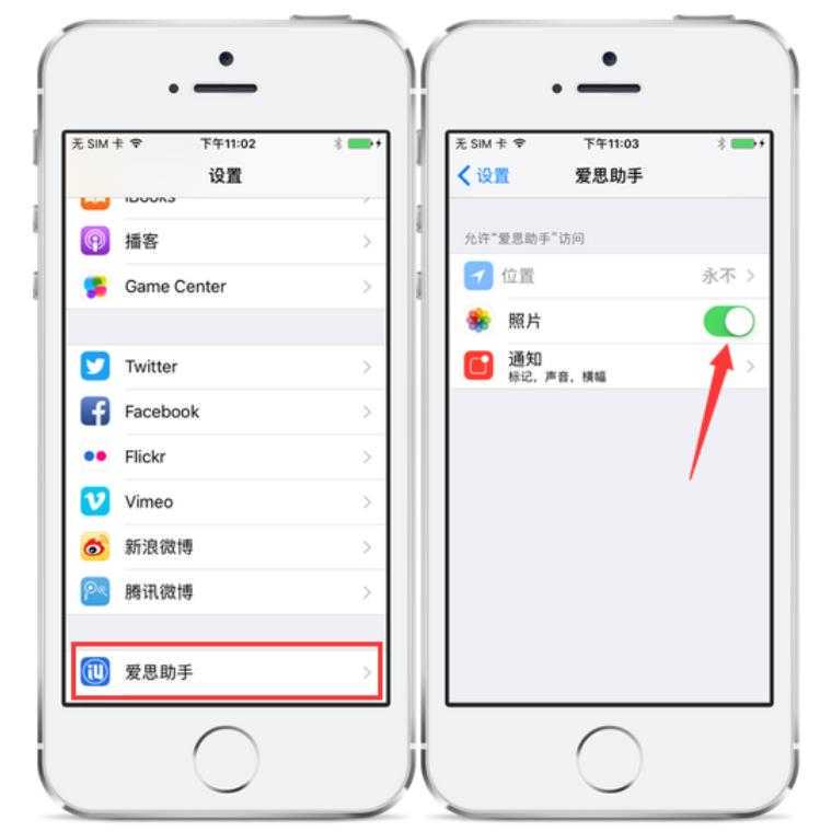 打开移动设备上的“设置”,找到爱思助手并点击进入,将爱思助手里面的“照片”开关打开。