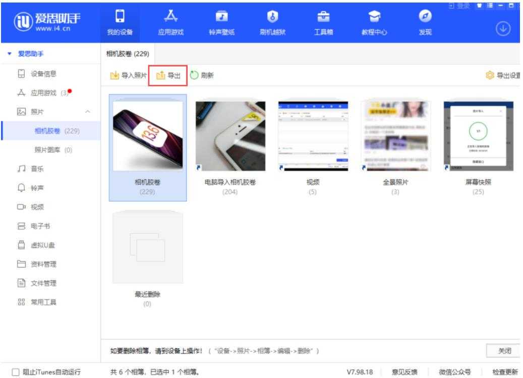 在照片管理主界面中,找到并选中需要备份的相簿,点操作栏中的导出按钮,将照片导出到电脑中,确保导出成功后,删除该相簿内的部分或者全部照片即可释放设备存储空间: