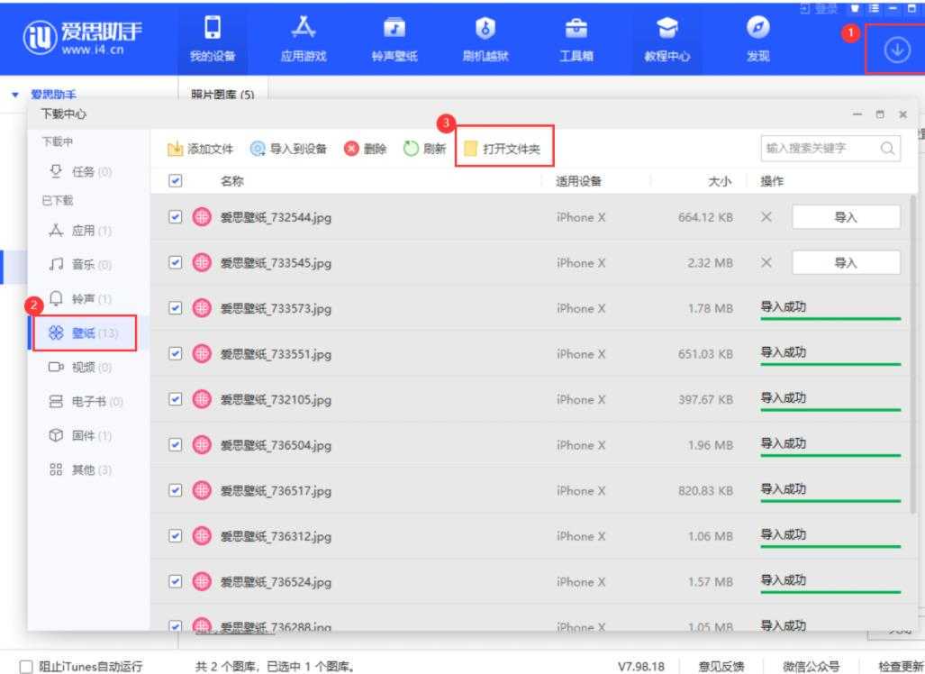 3、如果您需要导入壁纸可以随意在手机中删除,可以通过爱思下载中心找到这些壁纸,然后将图片导入到相机胶卷中。