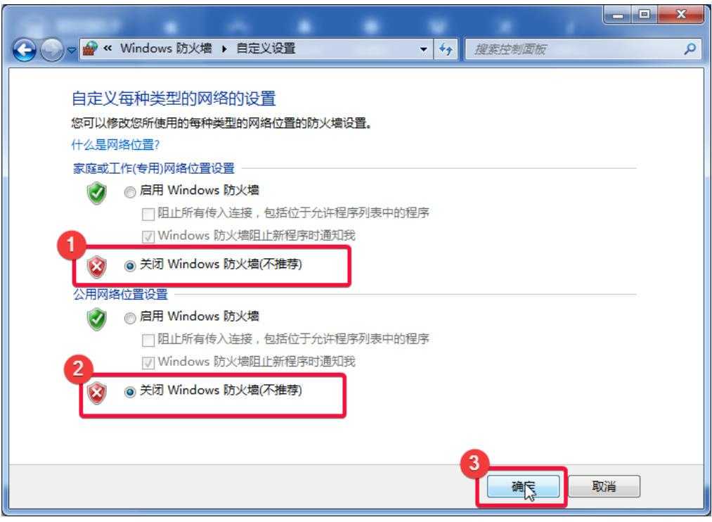 防火墙关闭方法:控制面板--系统和安全--Windows 防火墙--启用或关闭 Windows 防火墙--关闭防火墙。
