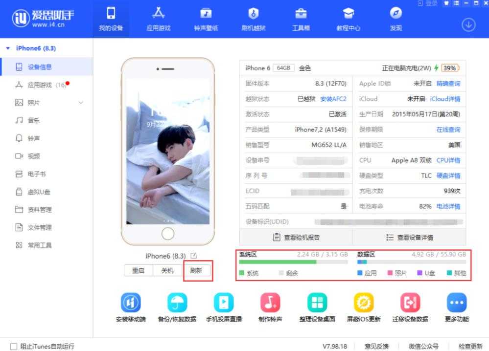 请在“设备信息”界面点击“刷新”按钮来刷新设备信息,并查看系统区和数据区剩余容量是否充足。