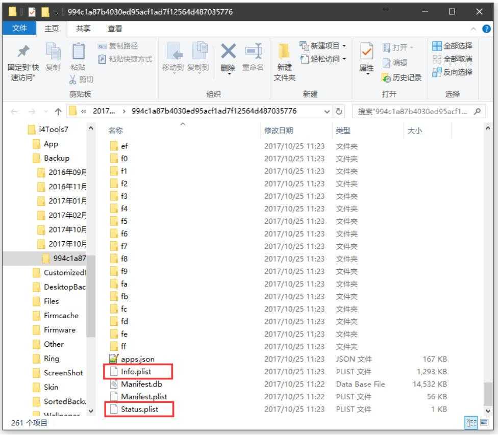 3、完成第一步和第二步之后,打开新备份的文件夹拉到最下面,找到“Info.plist”和“Status.plist”这两个文件,并复制到旧备份文件夹中;