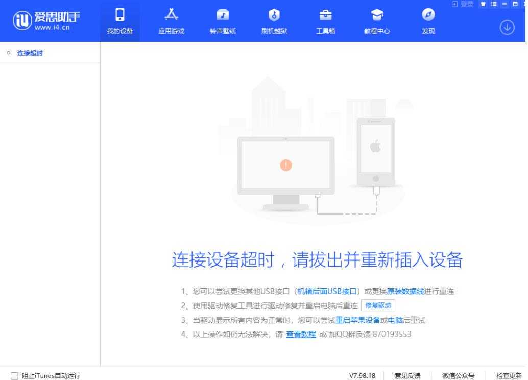 多次重连设备到电脑,爱思助手仍提示“连接设备超时”或“未发现设备”,可能是苹果驱动出现异常。