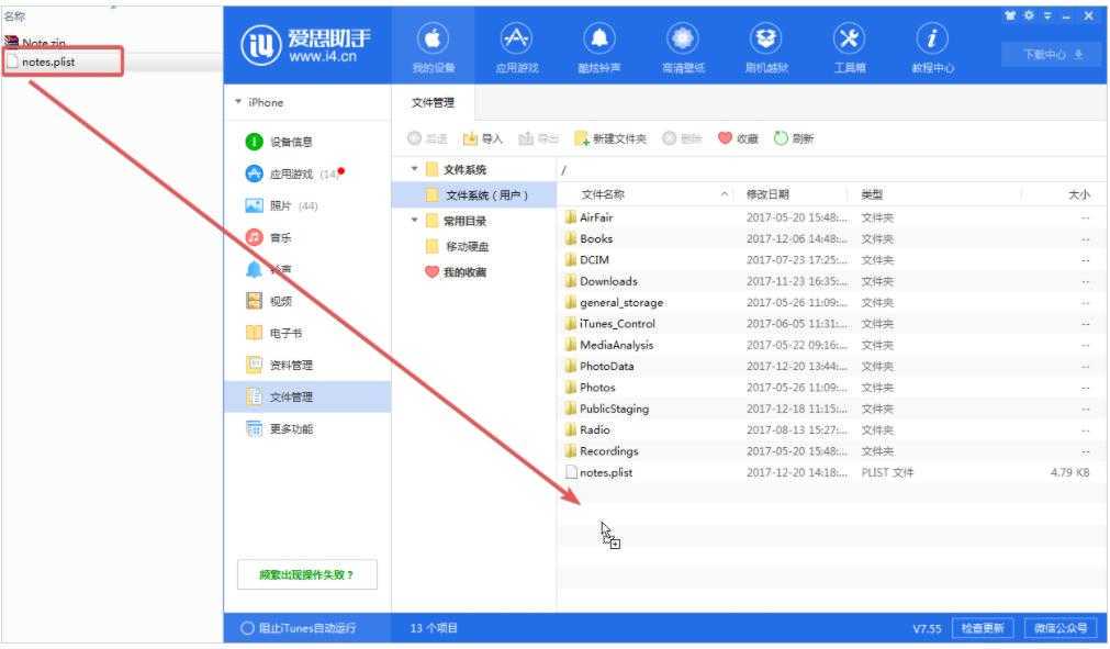 2、解压后会得到一个note.plist的文件,此时用数据线将手机连接电脑并打开爱思助手,打开“文件管理”并将note.plist 拖到爱思助手文件管理中。
