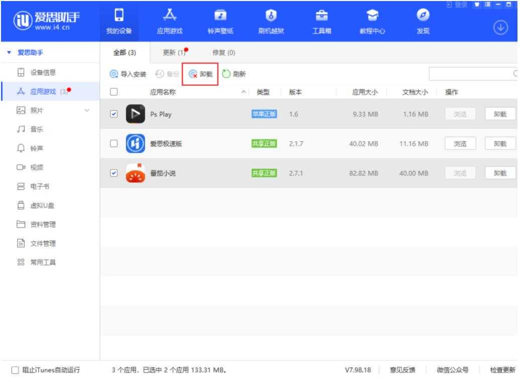 在应用游戏列表中找到并选中不常用的应用程序,点操作栏中的“卸载”按钮来卸载应用即可释放设备存储空间: