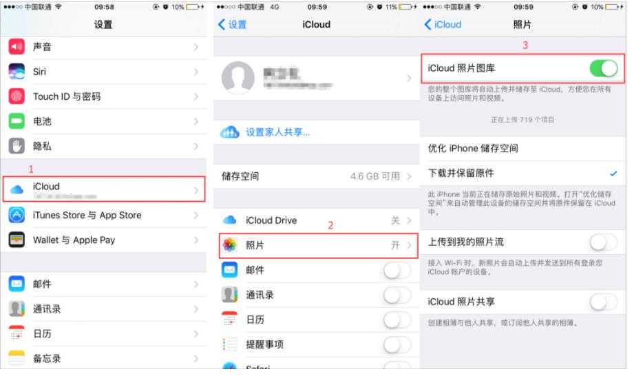 在移动设备上打开“设置->iCloud->照片”,查看“iCloud照片图库”后面的开关是否打开,如果已打开请点开关将其关闭。