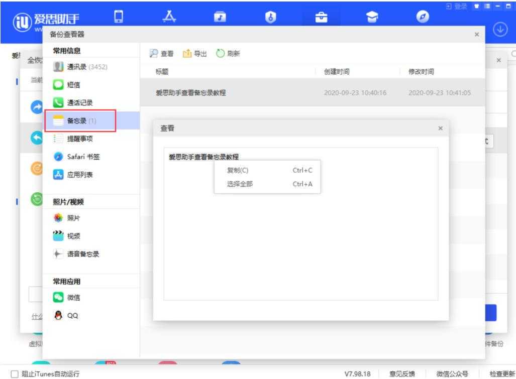 3.点击“备忘录”进行查看,使用鼠标右键点击备忘录查看或直接双击备忘录,出现弹窗后可进行复制;或选择需要的备忘录导出到电脑。