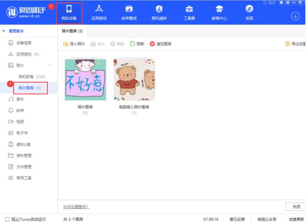 1、用数据线将苹果设备连接电脑后,在“我的设备”下点击“照片-照片图库”,就可以看到通过 PC 端导入的壁纸;