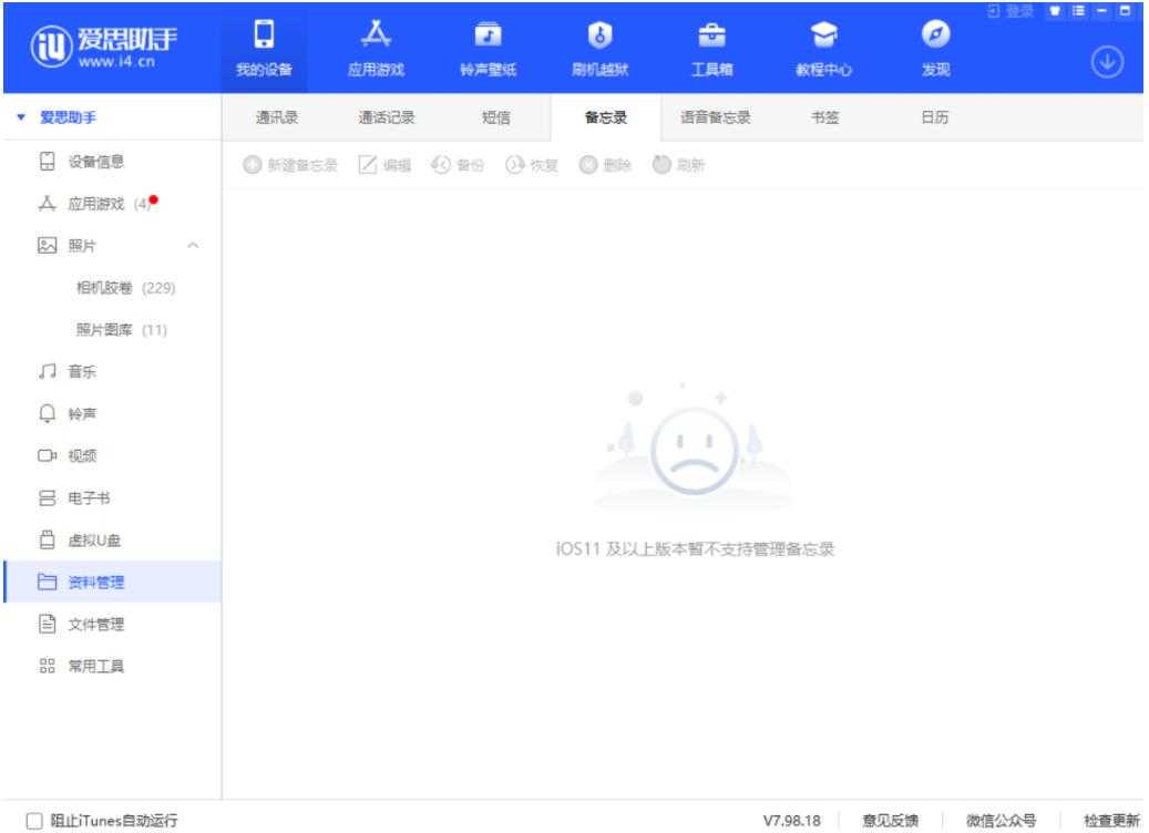 苹果设备升级到 iOS 11 或更新系统后,在爱思助手“资料管理”中将无法直接查看和管理备忘录: