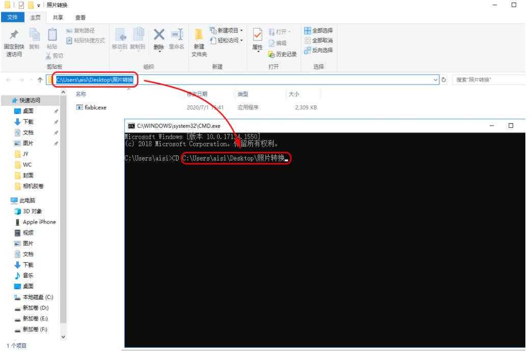 打开电脑端命令行程序(CMD),输入“CD [转换工具保存路径]”然后回车。注意“CD”后面要加空格,这里的“[转换工具保存路径]”,可以打开文件夹后直接复制。