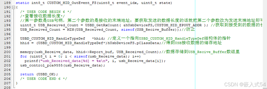 l 复制接收数据:使用memcpy()函数将USB设备接收到的数据从USB设备的接收缓冲区hhid->Report_buf复制到用户定义的缓冲区USB_Recive_Buffer中。