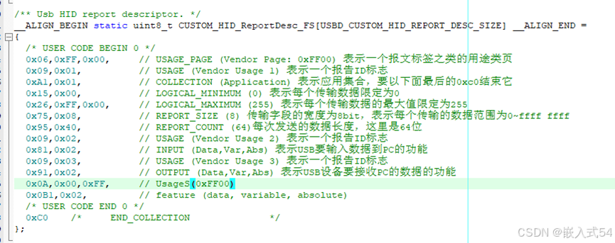 这个描述符定义了一个自定义的USB HID报告格式,其中包括了输入(IN)和输出(OUT)(64个字节)。