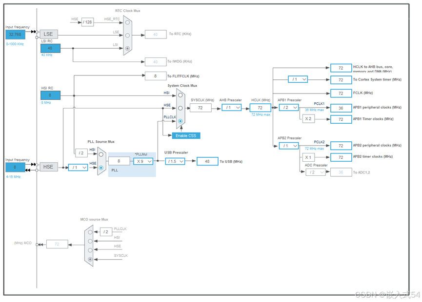 USB 时钟配置为 48MHz,且来源最好是外部晶振分频得到,因为外部时钟更准确。