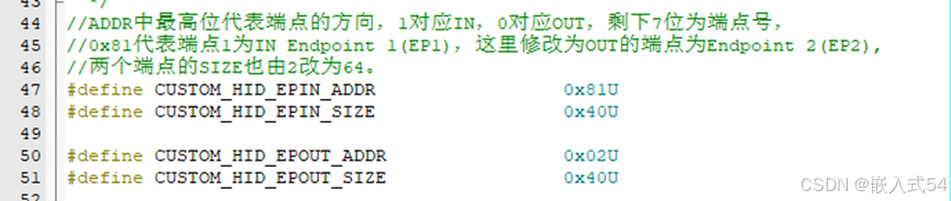ADDR中最高位代表端点的方向,最低位的1对应IN,0对应OUT,剩下7位为端点号,0x81代表端点1为IN Endpoint 1(EP1),这里修改为OUT的端点为Endpoint 2(EP2),两个端点的SIZE也由2改为64(因为描述符写了发送64个字节,所以这里改成0x40,可根据实际需求修改)。