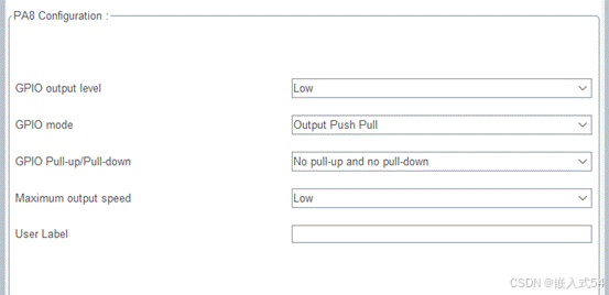 (因为PA8连接了一个三极管,控制上拉电阻。就是PA8给0,就有上拉电阻)