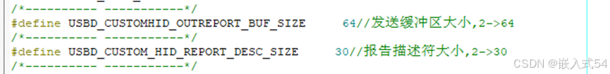 发送缓冲区大小USBD_CUSTOMHID_OUTREPORT_BUF_SIZE改为最大的64byte,另外报告描述符大小USBD_CUSTOM_HID_REPORT_DESC_SIZE改为30(可根据描述符的大小修改)。