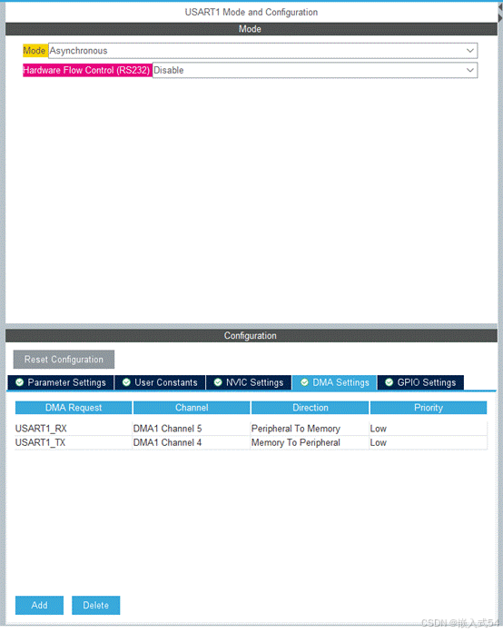 使用USART1(PA9 PA10)、波特率、8位、无验证位、1位停止位、使用了DMA