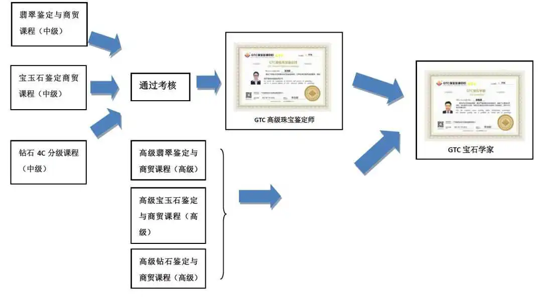 3、修读完三门课程(中钻、中宝、中翡)可获GTC“高级珠宝鉴定师”证书;修读完五门课程(“中钻、中宝、中翡、高钻、高宝、高翡”其中五门)可获GTC“宝石学家”证书。