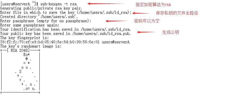 首先,说明一下我们要做的是,serverA 服务器的 usera 用户免密码登录 serverB 服务器的 userb用户。