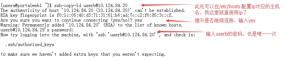 这个时候usera的公钥文件内容会追加写入到userb的 .ssh/authorized_keys 文件中