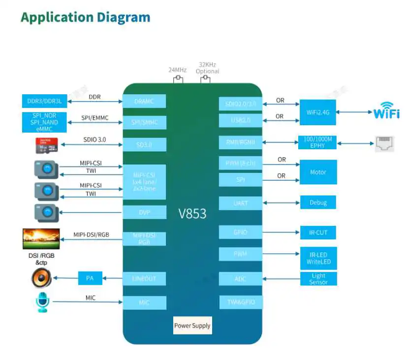 ARM或RISC-V 处理器配合片上RAM,以及支持多类内存接口和丰富的外设端口,为应用端提供更加丰富的适配场景。
