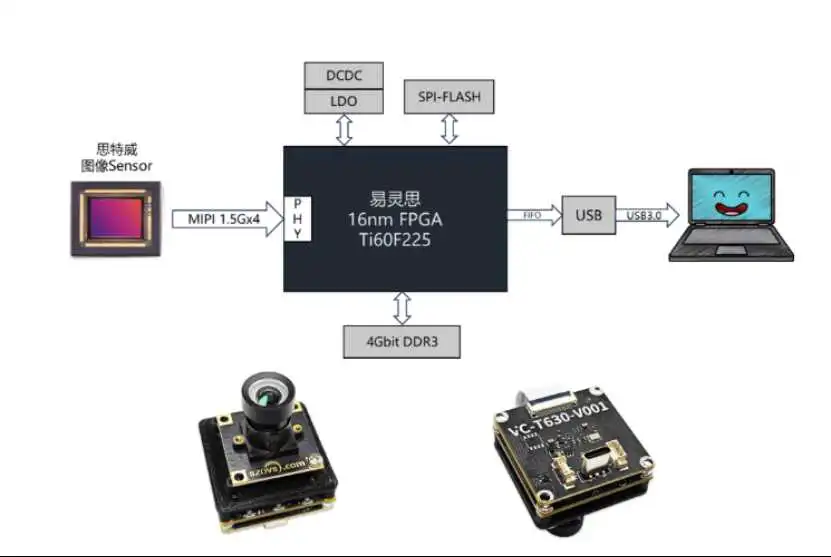 易灵思钛金系列Ti60 FPGA可提供1.5G MIPI CSI/DSI IP实现Sensor的多通道接入,同时提供DDR3控制器,在高达12.8Gbps带宽下完成快速的数据吞吐和帧缓存任务,可调用1/2/4核RISCV-软核完成控制、调度等工作,将工业相机性能推向极致。除逻辑特性外,Ti60 FPGA具备低功耗、小体积特点,可助力拇指相机类无特殊散热设计的特色产品。其核心控制板,尺寸仅4*4cm大小。