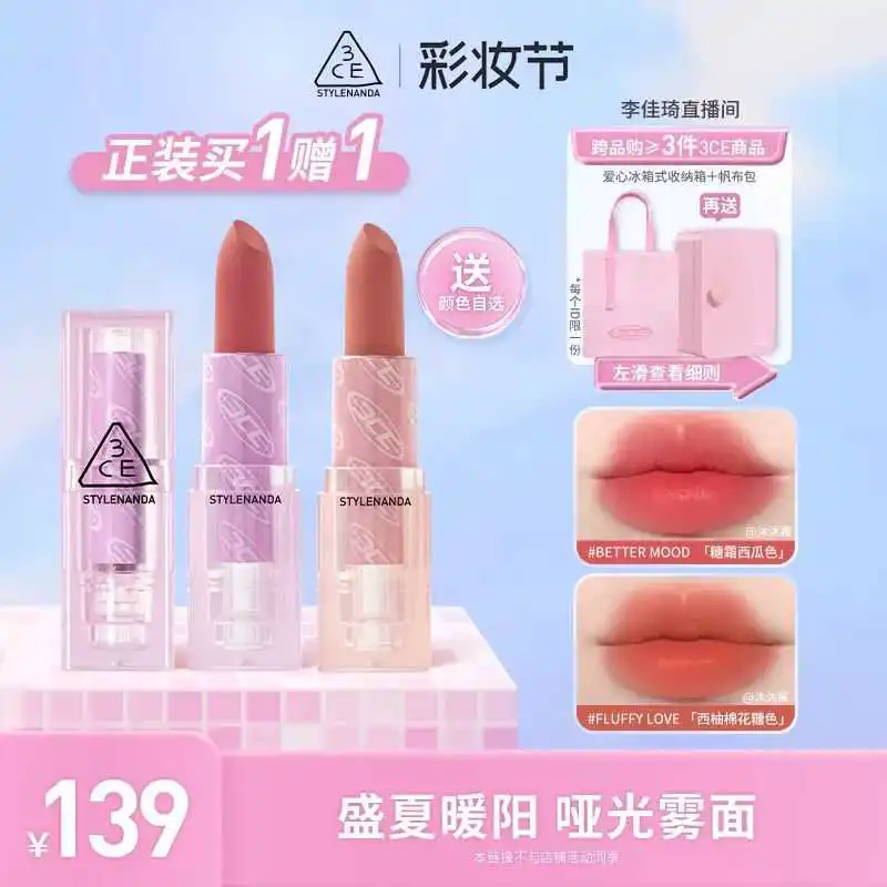 【李佳琦直播间】3CE透明口红 海蓝管暮色口红雾面豆沙色唇膏NH*