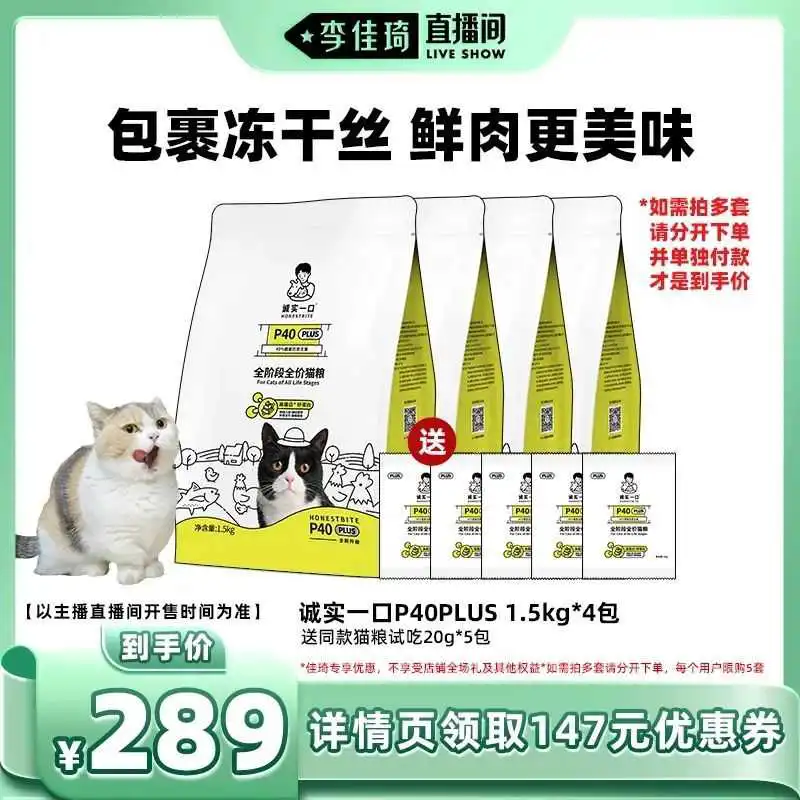 【李佳琦直播间】诚实一口P40 PLUS零肉粉全期全价鲜肉猫粮6kg