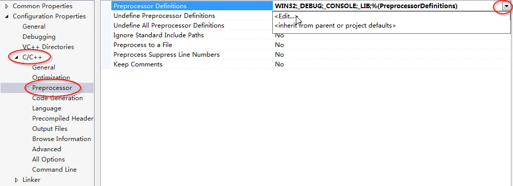 如图,选择“Configuration Properties” -> “C/C++” -> “Preprocessor” -> “Preprocessor Definitions”。点击右边的下拉箭头,之后点击“Edit”。
