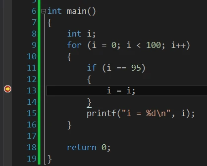这段代码很简单,打印0~99这100个数,假如,我是说假如你的程序运行到第95次循环时出现了问题,如果你想单步调试看看i的变化情况,你不可能一直按F10直到第95次循环。那样手肯定吃不消。这时候,就用到了条件断点的方法。修改代码如下: