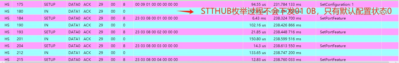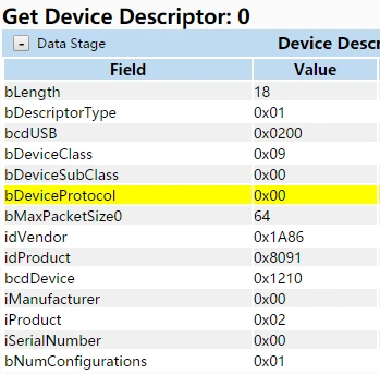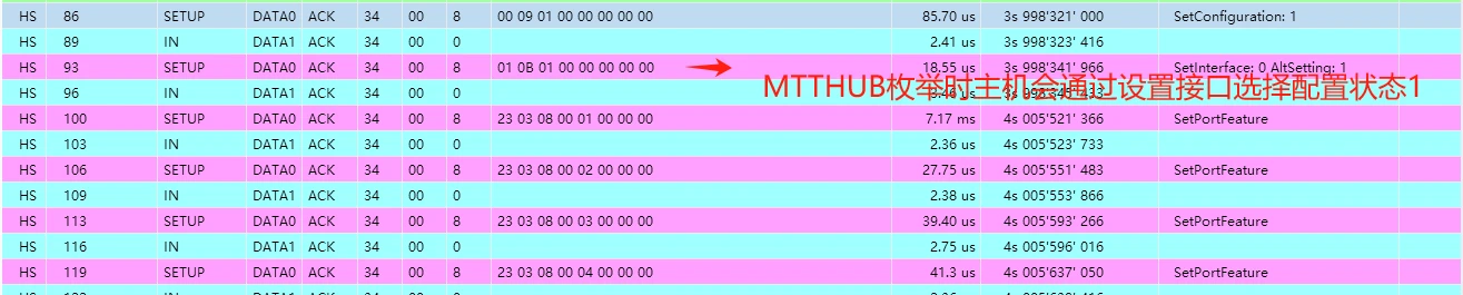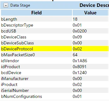 例如:由上述高速模式下STTMTT HUB的不同接口描述符可知,CH334有两个不同的接口描述符,其中STT HUB接口描述符集中bAlternateSetting字段默认状态配置为0,而MTT HUB在设置配置后,主机驱动会选择更高效的MTT方式, 通过01 0B 01 00 00 00 00 00方式设置接口命令bAlternateSetting此字段为1