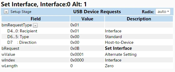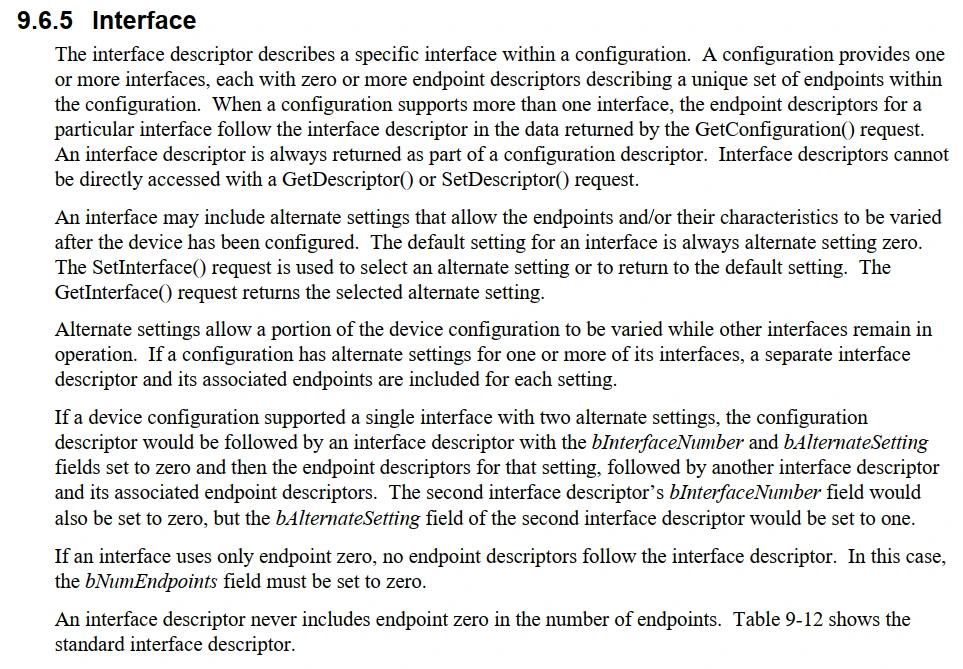 如果设备配置支持具有两个备用设置的单个接口,则配置描述符后面跟着一个接口描述符,其中包含 bInterfaceNumber 和 bAlternateSetting字段设置为 0,然后是该设置的端点描述符,然后是另一个接口描述符及其关联的端点描述符。第二个接口描述符的 bInterfaceNumber 字段将也设置为 0,但第二个接口描述符的 bAlternateSetting 字段将设置为 1。