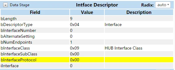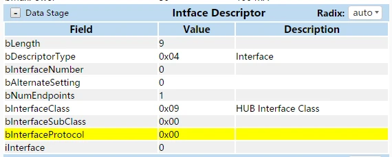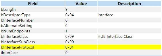 工作在低速或者全速模式下的HUB,其设备描述符的bDeviceProtocol必须为0,同时其接口描述符的bInterfaceProtocol也必须为0。