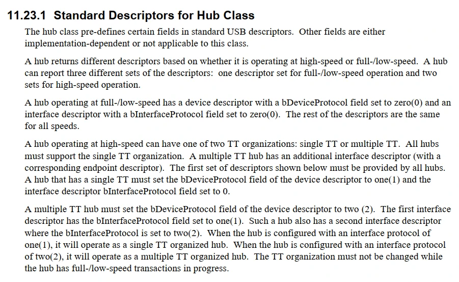 工作在高速模式下的HUB有两种描述符集,分别为单TT和多TT.所有的HUB必须支持单TT,故必须支持单TT描述符集。多TT集线器相对于单TT增加了一个额外的接口描述符(带有对应的端点描述符)。