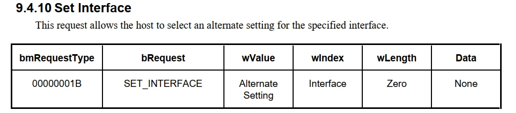 每一个接口都有一个唯一确定的接口编号,但是一个接口却可以由不只一个接口描述符来描述它。USB 允许多个接口描述符来描述同一个接口,且这些描述符都可通过命令切换。控制传输中的 Get_Interface 命令可以用来得到目前正在使用的描述一个确定接口的接口描述符的编号,即对应 bAlternateSetting 字段,而 Set_Interface 命令则以此字段值为参数, 用来使相应的接口描述符描述某个确定的接口。