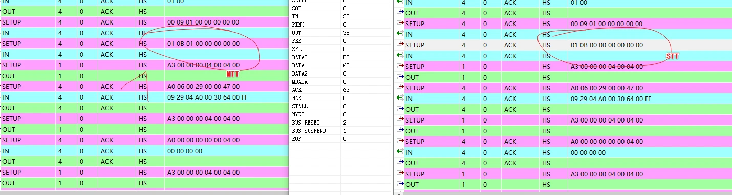 此处验证,通过修改主机驱动和通过BUSHUND软件对应端点下发设备接口命令01 0B 00 00 00 00 00 00也可以主动修改不同的接口描述符以对应主机选择用STT还是MTT模式
