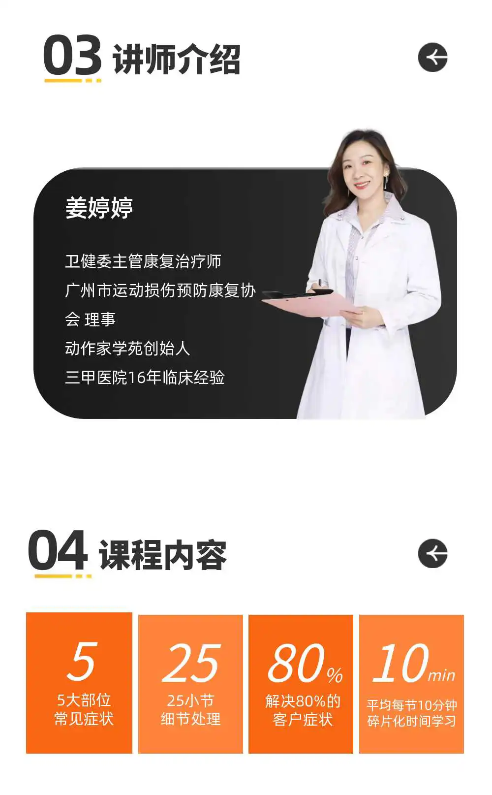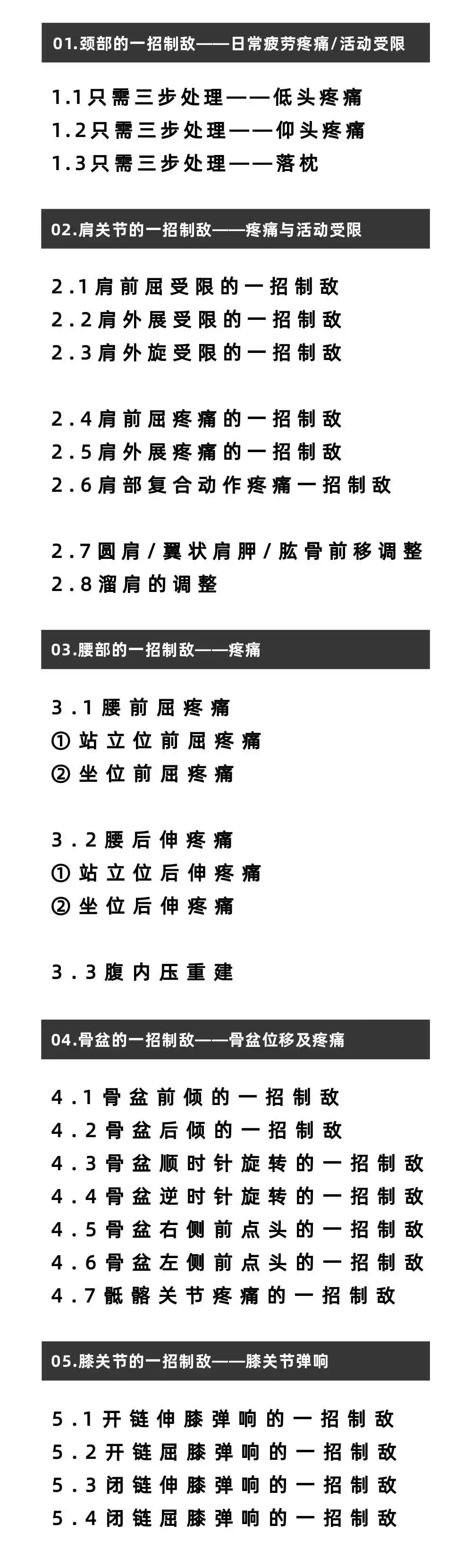 最理想的学习状态一定是,从最基础的理论知识学习开始搭建基础,在评估的学习中找到问题根源,在与众多从业多年的治疗师接触后,我们总结出了最高效的学习途径:并将其融入到《一招制敌 0基础快速入门运动康复》课程中,先学习如何解决患者的即时问题 (例如全身关节功能障碍软组织疼痛、不良体态矫正),通过工作总结后,再来学习背后的逻辑,是最快的学习模式。