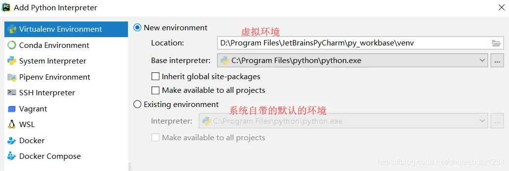 例如使用pycharm的时候,会让选择是否使用虚拟环境(Virtualenv)