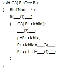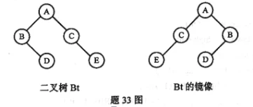 34.已知二叉树的二叉链表类型定义如下:typedef struct node { char data; struct node *lchild, *rchild;}BinTNode;typedef BinTNode * BinTree;函数f33的功能是将二叉树Bt变换为它的镜像。镜像的含义如题33图所示