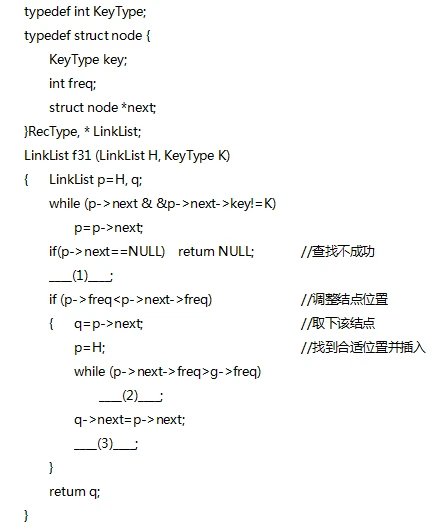 32.带头结点的单链表定义如下,其中freq域记录本结点被访问的次数,初值为0,单链表始终以freq值从大到小有序。函数f31完成的功能是:查找给定关键字所在结点,若查找成功,则该结点的freq域加1,并按freq值调整结r旨位置。请将空白处(1)~(3)补充完整。在答题卡上作答。