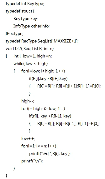 若顺序表R的元素个数n=6,关键字依次为{41,82,75,24,8,16},则:(1)写出函数f32执行后的输出结果:(2)函数f32的功能是什么?
