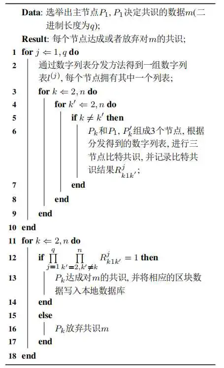 区块链是通过共识协议保证节点间账本数据一致、通过密码学保证交易数据不可篡改与发送安全的点对点(集体维护、去中心化)的分布式数据库系统与中心化系统相比,去中心化的区块链技术有着更高的可信透明度、容错性和抗攻击性,并被广泛应用到金融、医疗、能源、溯源等多个领域。区块链在发展过程中,面临的制约因素主要有交易处理性能限制、扩展性限制、易用性限制、跨链互联限制、存储限制、缺乏严格数学证明、缺乏形式化证明、区块同步限制、治理与监管限制、软件升级分叉限制等。共识算法的性能及效率是其中的重要难题。该难题和拜占庭将军问题本质上是一致的:在已知有将军是叛徒的情况下,其余诚实的将军如何达成一致行动。拜占庭将军问题的解可称作拜占庭协议,也就是设计满足以下2个条件的协议:1) 所有诚实的将军执行同一个计划; 2) 如果指挥官是诚实的,那么所有诚实的将军都遵守指挥官所制定的行动计划。