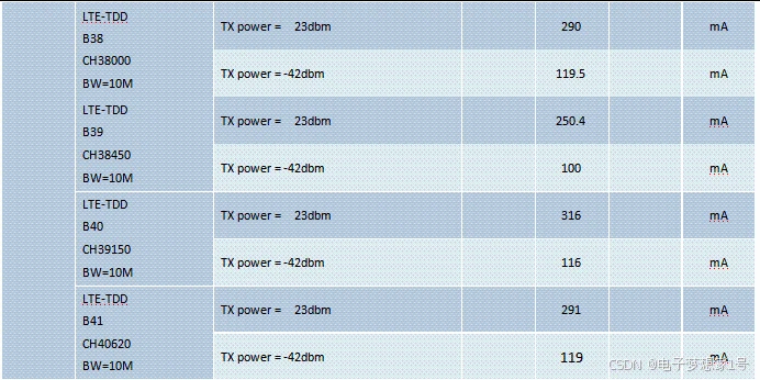 测试条件:VBAT=3.8V,环境温度 25℃,插入白卡,连接综测仪 CMW500
