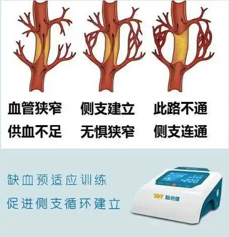 通过做缺血预适应训练,可有效促进小血管建立起侧支循环,当主动脉发生狭窄或阻塞,血液便可通过侧支绕过阻塞部位进行输送,侧支逐渐变粗、血流量逐渐增大,侧支循环代偿增多,保障全身血液的正常输送,有效避免脑梗死、心脏猝死等恶性心脑血管事件的发生。这些通过侧支重新建立起来的循环称为侧支循环。侧支循环与冠状动脉搭桥术有异曲同工之妙。